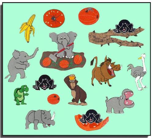Anansi eating a broken melon, small Anansi on the outside of melon, small Anansi in the melon, elephant hoeing the melon garden (6 " tall), banana, warthog, ape, turtle, elephant walking,rhinoceros, small melon with holes, ostrich (6" tall), and hippopotamus.