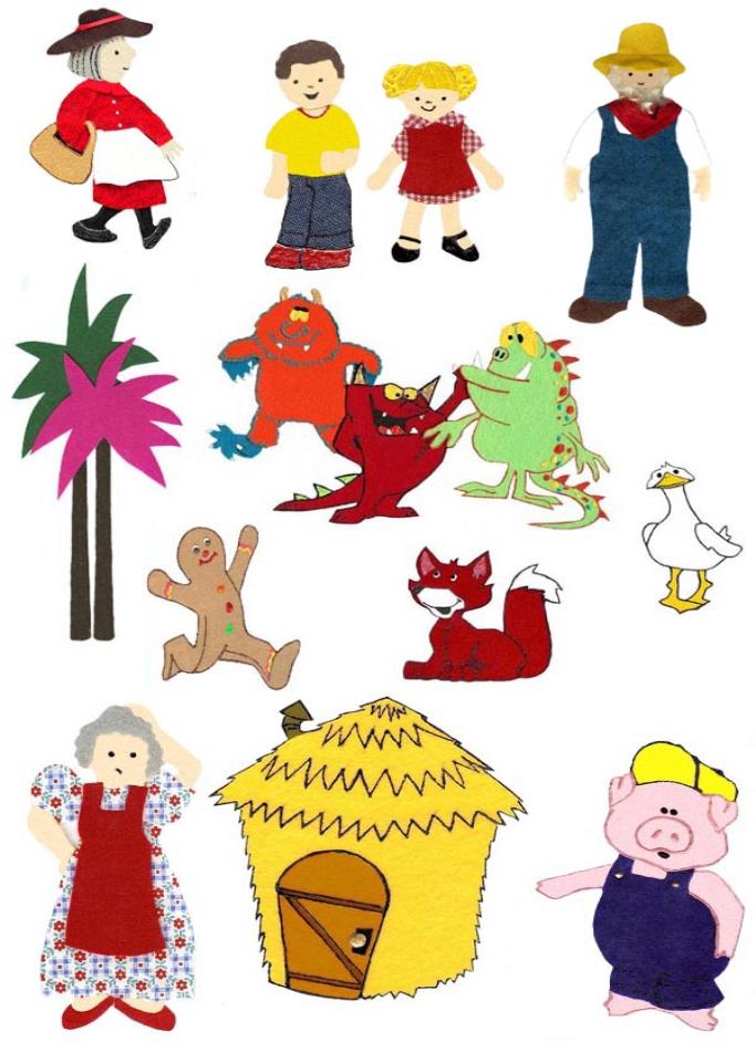 The PDF (Acrobat Reader) formatted CD-ROM makes it easy to find the story sets and pages that you want to print. Each tale/story has its own suggested separate pages. On average there are about 3 pages per story. Print the pages for a story on white paper, laminate the pages for durability, bond (spray adhesive) with soft felt, and then use scissors to cut out the pieces for your new storytelling set. It's that easy! Another quick way to make your story sets is to use iron-on T-shirt transfers. Print a story set on transfer paper, iron the transfer on to a piece of felt, then cut the story pieces out. The characters/figures also can be used in a host of other ways including bulletin boards, wall displays, literacy bags, classification activities, and identification games. However you choose to use the storytelling sets, you'll find that children love the large, expressive pieces and bright colors!