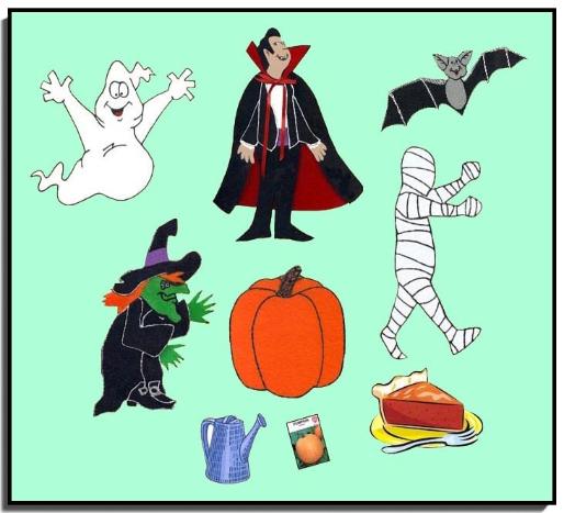 mummy 7 1/2", bat 7" wide, pumpkin 5"