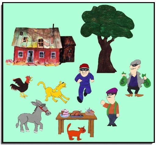 food (6" wide), 3 robbers (each 5 1/2" tall), tree, and an old house (10").