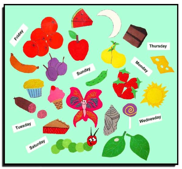 cheese, watermelon, salami stick and slice, sausage, ice cream cone, cucumber, cupcake, lollipop, sun (5"), moon, chrysalis, apple, 2 pears, 3 plums, 4 strawberries, 5 oranges, 2 leaves (one with egg), 7 days of the week, a very hungry caterpillar, (8") and a smiling butterfly (5 1/2" x 6").
