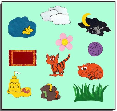 in night sky, worms in dirt, flower, rug, clouds, mother cat with offspring, and blue sky with bird.
