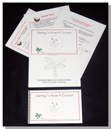 This activity focuses on writing through science. Children work with a coconut, learn new facts about coconuts, make observations, and write descriptive words. After working hands-on with the coconut, students complete their booklet. The picture of a completed spiral-bound teacher booklet is shown only as an example and is not included. All the pages needed to make and reproduce the booklet are included. (completing a simple book; write descriptive words; make observations)
