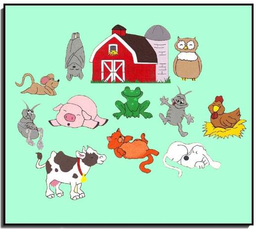 1/2"), dog, cat, ill flea, chicken, owl, rat, bat, frog, sneezing flea (4"), and barn.