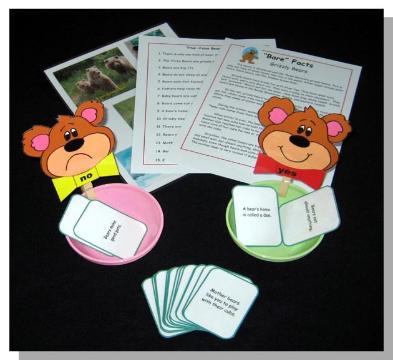Who are these bears?...grizzly, you say! This activity includes bear photos, bear information, questions to solicit discussion for prior knowledge and new knowledge. Then students can sort bear questions into 2 small sorting bowls identified with “Yes” and “No” bears. (sort information correctly)