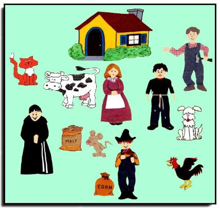 tattered man (6") farmer (7"), priest (7 1/2"), a bag of malt, a bag of corn, rat, cat, dog, rooster, and crumpled horn cow.