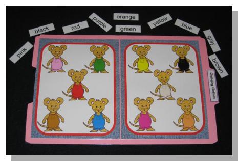 Mouse likes color! Students match color names with Mouse in colorful overalls. (color recognition; matching colors with color words)