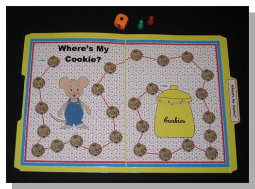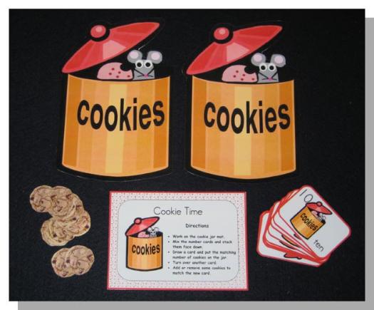 Simple, fun counting game. Each player gets a cookie jar mat where by drawing cards (1-10) either adds cookies to his jar or subtracts cookies from his jar. (counting; simple addition and subtraction)