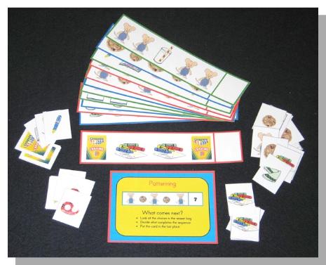 Complete the pattern on each strip. Set includes 12 strips (10.5” x 2.5”) and pattern card answers to complete the patterns.