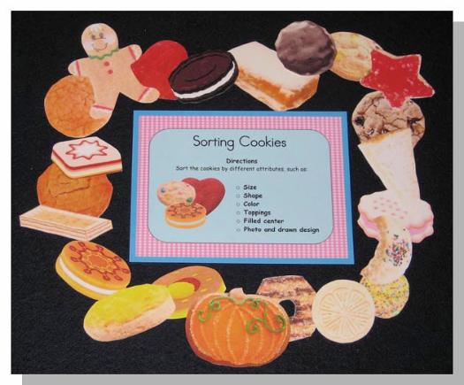 Cut-out cookies are sorted and put into different categories by attributes. Possible attributes include size, color, shape, photo/drawn, size, toppings, filled centers, etc. (sorting by attributes)