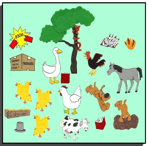 hen, 9 chicks (3 groups of three), 3 books, dog with head in a hole, dog running away, frightened cat in a tree (9:), fire, chicken feeder box, chicken water fountain, firecracker box, boom starburst.