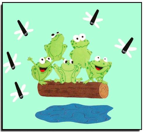 speckled log (10 1/2"), 5 insects (3" each), and pond (10"). Log and the pond are felt with hand-painted features.