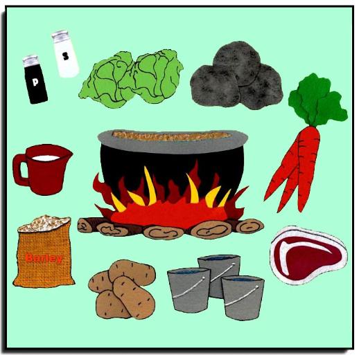 meat 4 1/2", salt and pepper 3", stones 5", barley 4", cup of milk 3", water pails 5".